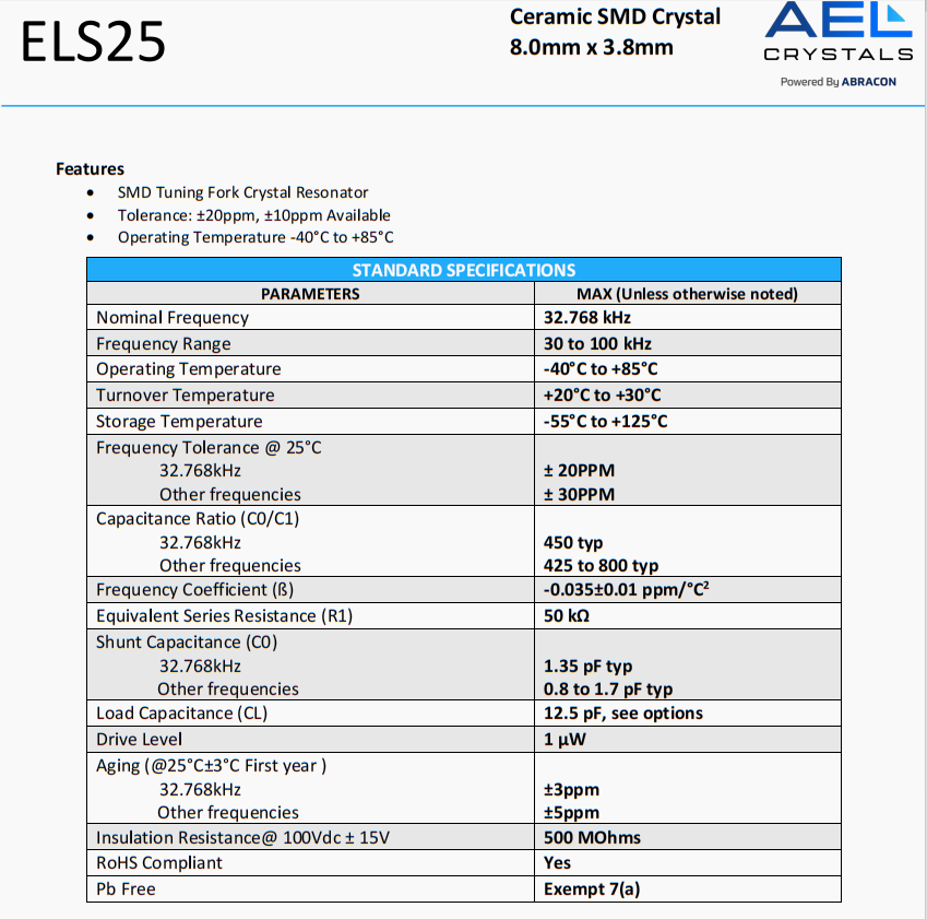 | ELS25-32.768kHz-T | AEL Crystals | ELS25 | 32.768 kHz | 0 | ±20ppm | 12.5 pF |