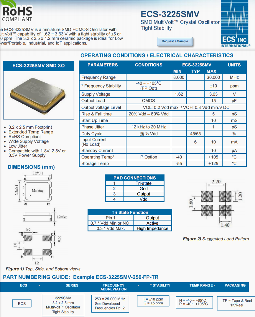 ECS-3225SMV-250-FP-TR晶振,進(jìn)口ECS有源晶振,醫(yī)療設(shè)備晶振,美國ECS晶振公司,伊西斯無源晶振,ECS-3225SMV-250-FP-TR晶振,25MHz晶振,3225晶振,超小型晶振,四腳貼片晶振,石英晶體諧振器,美國進(jìn)口晶振,高精度晶振,耐高溫晶振,汽車電子晶振,工業(yè)設(shè)備晶振,物聯(lián)網(wǎng)晶振,COTS晶振.ECS-3225SMV是一款微型SMD HCMOS振蕩器,MultiVolt™能力為1.62 ~ 3.63 V,穩(wěn)定性為±5或±10 ppm。3.2 x 2.5 x 1.2 mm陶瓷封裝是低功耗/便攜式,工業(yè)和物聯(lián)網(wǎng)應(yīng)用的理想選擇。