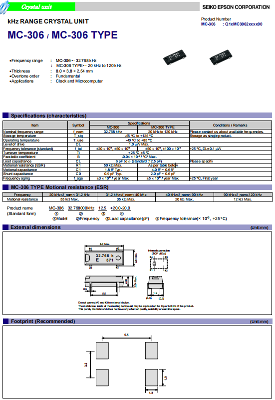 | Q13MC3061002200 | 8 x 3.8 x 2.54 mm | MC-306 | 32.768000 kHz | 7 pF | -40 to +85 °C |