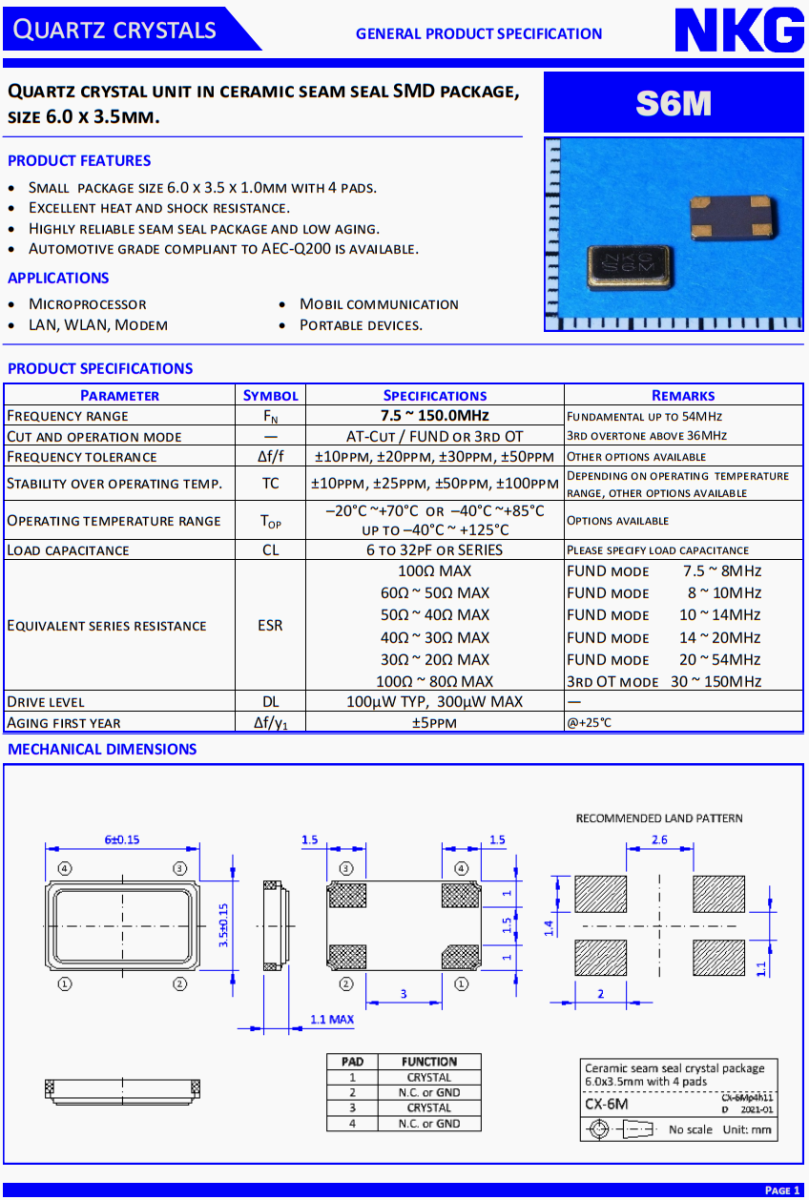 - 產(chǎn)品描述:多功能方向盤晶振,NKG晶振,S6M100.0000F18EYY-EXT四腳晶振。石英晶體單元在陶瓷縫密封SMD封裝,尺寸6.0x3.5mm。S6M。產(chǎn)品特點(diǎn):小包裝尺寸6.0x3.5x1.0mm與4個墊。優(yōu)異的耐熱性和抗震性。高可靠的縫封封裝,低老化。符合...