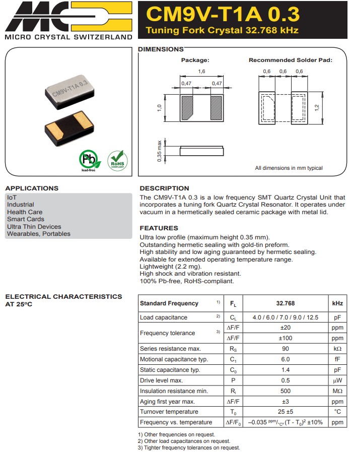 | CC1V-T1A-32.768kHz-9pF-30PPM-TA-QC | Micro Crystal | 晶體 32.768 kHz 9.0 pF +/-30 PPM -40/+85C |