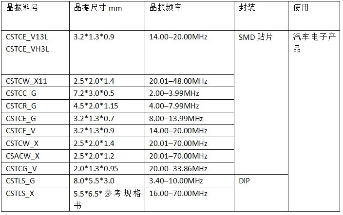 對于陶瓷晶振大家應(yīng)該不陌生,通常我們在辦公室看到的電話座機(jī)就會使用到陶瓷晶振,還有家有的遙控電路模塊也會使用到ZTT(三腳)和(ZTA)兩腳陶瓷晶振。那么接下就是給大家盤點(diǎn)一些汽車專用的村田貼片晶振與插件晶振的參數(shù),需要的可以拿個小本本記下來哦 村田晶振配備內(nèi)藏負(fù)載電容器的緊湊封裝型片狀“CERALOCK(陶瓷振動子)”可保證極高的精確度,頻率的調(diào)整和表面封裝專有的技術(shù),實現(xiàn)了負(fù)載電容器內(nèi)藏片狀“CERALOCK”,振蕩電路無需任何外部連接負(fù)載電容器,內(nèi)部采用了村田先進(jìn)技術(shù)添加的內(nèi)部負(fù)荷電容,適用溫度低溫可到-40℃至120℃符合現(xiàn)實汽車內(nèi)置的高溫環(huán)境正常工作,產(chǎn)品具有外觀尺寸小,超薄,很適合汽車電子防盜遙控等小型產(chǎn)品應(yīng)用。