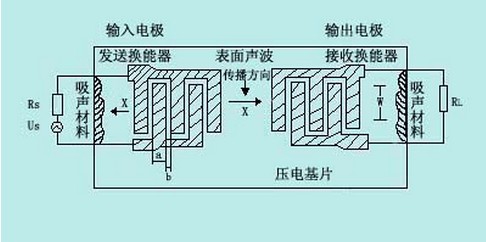 這種濾波器的基片是由壓電材料(如鈮酸鋰或石英晶體)制成,在基片上蒸鍍兩組“叉指電極”,一般由金屬薄膜用光刻工藝刻成。左側(cè)接信號(hào)源的一組稱為發(fā)送換能器,右側(cè)接負(fù)載的一組稱為接收換能器,圖中a、b分別為電極寬度和極間距離,W為相鄰叉指對(duì)的重疊長(zhǎng)度,稱為“叉指孔徑”。當(dāng)交變的電信號(hào)us加到發(fā)送換能器的兩個(gè)電極上時(shí),通過反壓電效應(yīng),基片材料就會(huì)產(chǎn)生彈性形變,這個(gè)隨信號(hào)變化的彈性波,即“聲表面波”,它將沿著垂直于電極軸向(圖中x方向)向兩個(gè)方向傳播,一個(gè)方向的聲表面波被左側(cè)的吸聲材料吸收,另一方向的聲表面波則傳送到接收換能器,由正壓電效應(yīng)產(chǎn)生了電信號(hào),再送到負(fù)載RL。但叉指換能器的形狀不同時(shí),濾波器對(duì)不同頻率信號(hào)的傳送與衰減能力就會(huì)不一樣。