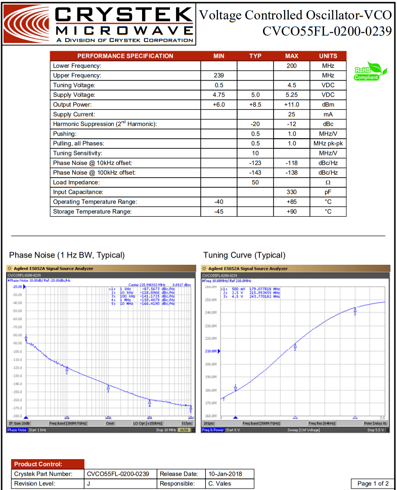 Fort Myers, FL - July 31, 2023 - Crystek's CVCO55FL-0200-0239 VCO (Voltage Controlled Oscillator) operates from 200 to 239 MHz with a control voltage range of 0.5 to 4.5 V. This VCO features typical phase noise of -123 dBc/Hz @ 10 kHz offset with excellent linearity. Output power is typically +8.5 dBm.