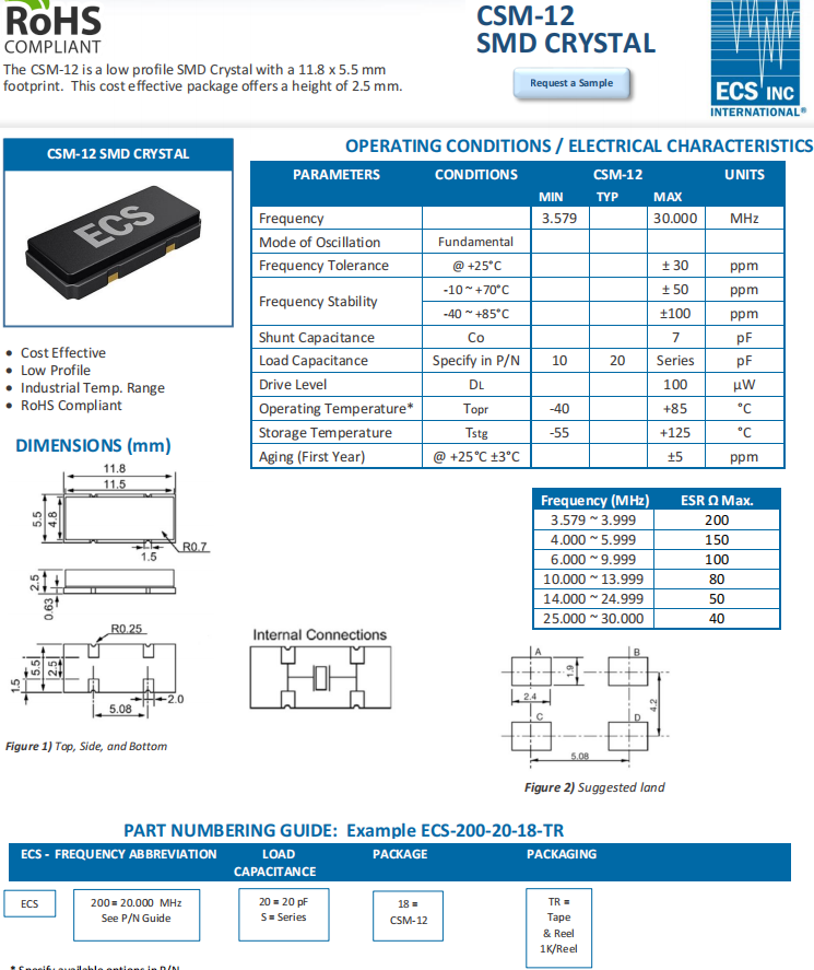 | ECS-50-18-18-TR | ECS Crystal | CSM-12 | 5MHz | -40°C ~ 85°C |