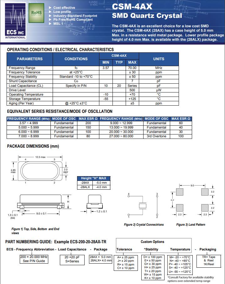 | ECS-40-20-28AX-TR | CSM-4AX | 4MHz | ±50ppm | ±30ppm | 20pF |