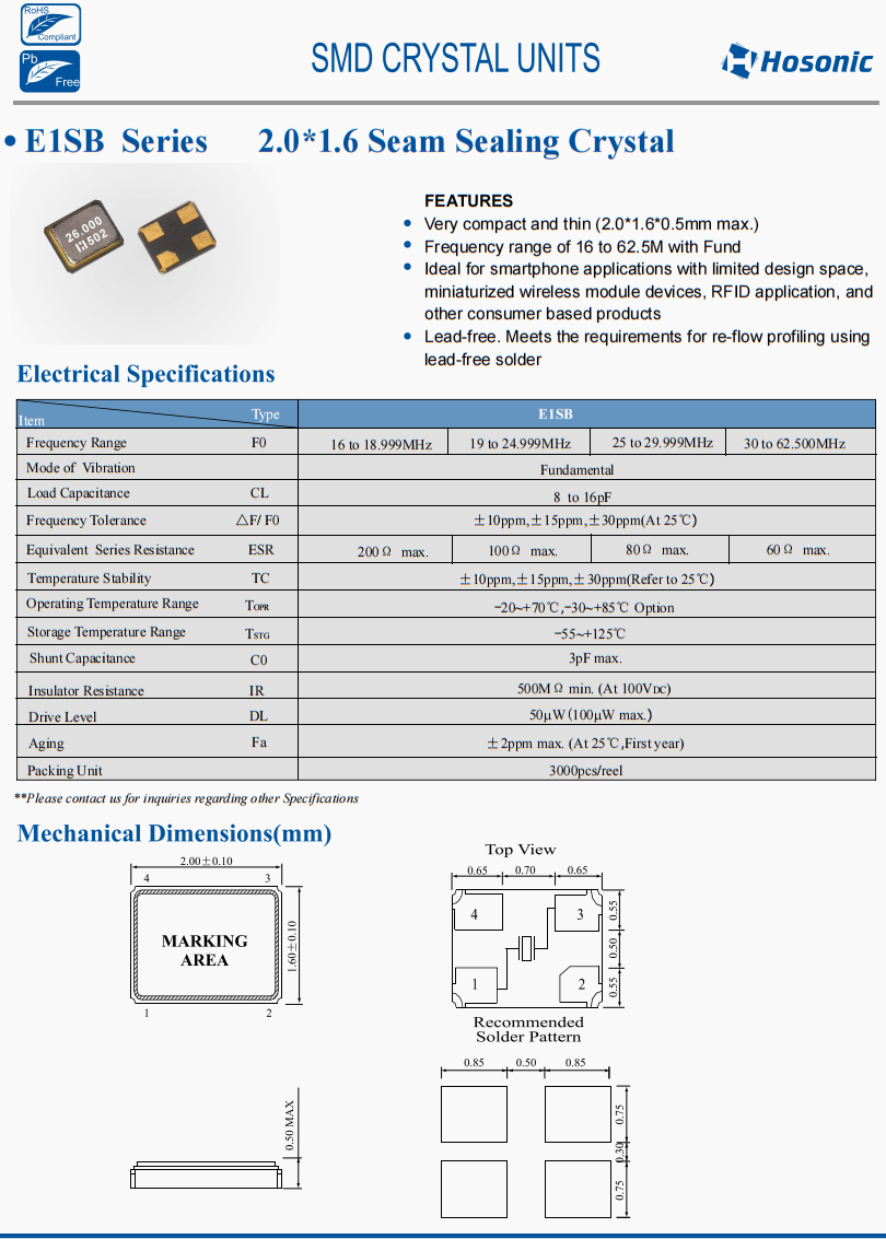 臺產(chǎn)鴻星晶振,E1SB16E000004E晶振,遙遙領(lǐng)先的6G路由器晶振,臺灣鴻星晶振公司,特點:非常緊湊,非常薄(最大2.0 *1.6*0.5mm),頻率范圍為16至62.5M,非常適合設計空間有限的智能手機應用,小型化無線模塊設備,RFID應用和其他消費類產(chǎn)品。滿足使用無鉛焊料的回流剖面要求。無源晶振,貼片晶振,小尺寸晶振,2016晶振,環(huán)保無鉛晶振,高精度晶振,無人機高清攝像模塊晶振,北斗衛(wèi)星定位模塊晶振。