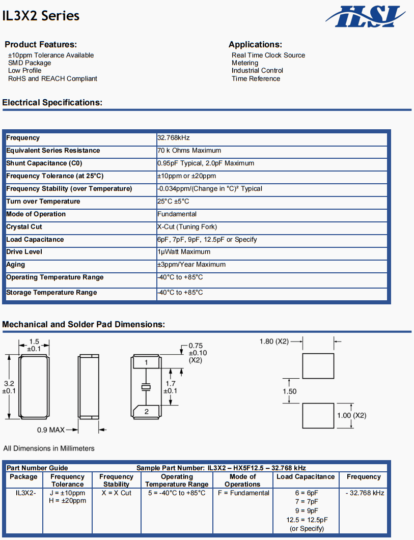 艾爾西音叉晶振,IL3X2二腳貼片晶振,IL3X2-HX5F9-32.768kHz無線路由器晶振,美國ILSI晶振公司,IL3X2晶振,IL3X2-HX5F9- 32.768 kHz晶振,特點:SMD音叉晶體諧振器,公差:±20ppm,±10ppm可用,工作溫度-40~85°C,高品質(zhì)晶振,進(jìn)口晶振,艾爾西晶振,進(jìn)口晶振,貼片晶振,3215晶振,智能手機晶振,移動通信終端晶振,基準(zhǔn)時鐘晶振,無線通信晶振,貼片晶振,WIFI用晶體,二腳晶振,歐美晶振,無源晶振,無人機晶振,電車充電槍晶振,石英晶體諧振器網(wǎng)絡(luò)服務(wù)器晶振,存儲卡晶振,無線局域網(wǎng)晶振,光纖通道晶振.