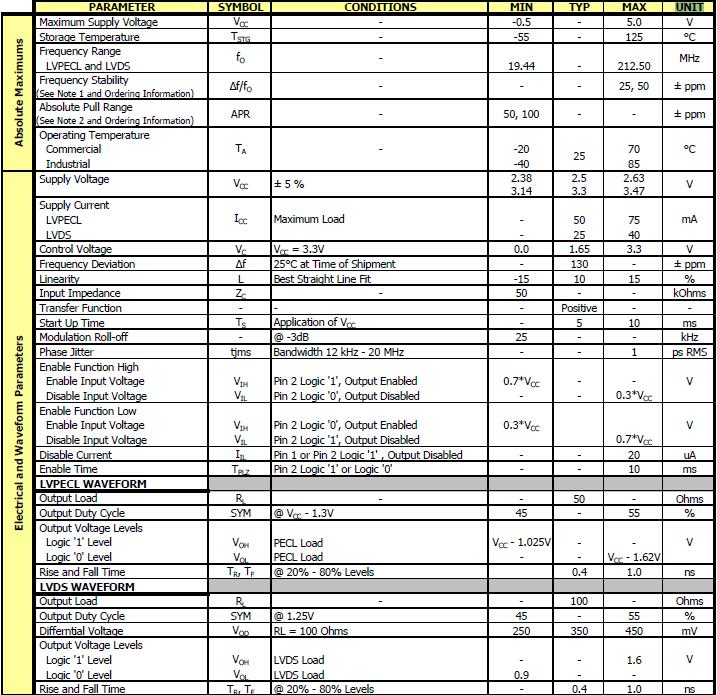 美國CTS晶振335的工作條件如下:最大的電源電壓VCC - -0.5 - 5.0 V,儲(chǔ)存溫度測(cè)試- -55 - 125°C,頻率范圍:LVPECL和LVDS 19.44 - 212.50,頻率穩(wěn)定度,控制電壓VC VCC = 3.3 V 0.0 1.65 3.3 V,在裝運(yùn)時(shí)間頻率偏移Δf 25°C - 130±ppm,L線性最佳直線符合-15年10 15%,輸出工作周期對(duì)稱@ 1.25 v 45 - 55%,差動(dòng)電壓VOD RL = 100歐姆250 350 450 mV,上升和下降時(shí)間TR,TF - 0.4 - 1.0 ns @ 20% - 80%的水平