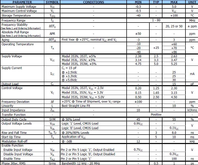 最大的電源電壓VCC - -0.5 - 5.0 V,最大控制電壓VC - -0.5 V電源電壓,儲(chǔ)存溫度測試- -40 + 100°C,頻率范圍fO - MHz頻率穩(wěn)定度,頻率偏移Δf + 25°C @裝運(yùn)時(shí)間,在VC±100——ppm范圍,允許輸入電壓VIH銷2或銷5邏輯“1”,輸出0.7 vcc——啟用,禁用輸入電壓維爾銷2或銷5邏輯“0”,輸出——0.3 vcc禁用,啟用時(shí)間TPLZ銷2或銷5邏輯“1”——- 100 ns,相位抖動(dòng),RMS tjrms帶寬12 kHz - 20 MHz - 0.5 - 1 ps.