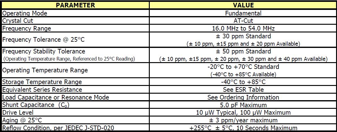 標(biāo)準(zhǔn)2.5 x2.0mm表面山足跡,在溫度和頻率穩(wěn)定,開(kāi)車(chē)水平,基本晶體設(shè)計(jì),頻率范圍16 - 54 MHz,頻率公差,±30 ppm標(biāo)準(zhǔn),(±10 ppm,±15 ppm和±20 ppm可用),頻率穩(wěn)定度,±50 ppm標(biāo)準(zhǔn),(±20±±10日,15日,±30和40±ppm),操作溫度為-40°C + 85°C,磁帶和卷軸包裝,eia - 481 - 2兼容,符合RoHS /綠(6/6).