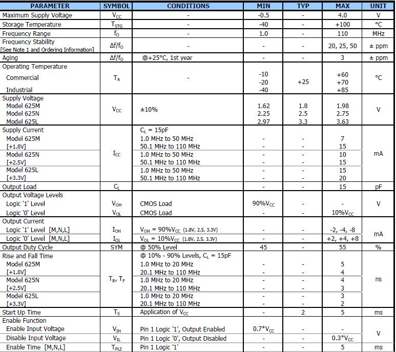 CTS石英晶振Model625,石英晶體振蕩器2520mm,標(biāo)準(zhǔn)2.5毫米x 2.0毫米4-Pad表面安裝包,HCMOS輸出,基本和第三泛音晶體的設(shè)計(jì),頻率范圍1 - 110 MHz,頻率穩(wěn)定度±50 ppm標(biāo)準(zhǔn),±25 ppm和±20 ppm,操作電壓+ 1.8 vdc,+ 2.5 vdc或+ 3.3伏直流,操作溫度為-40°C + 85°C,允許輸出標(biāo)準(zhǔn),磁帶和卷軸包裝標(biāo)準(zhǔn),eia - 418,符合RoHS .