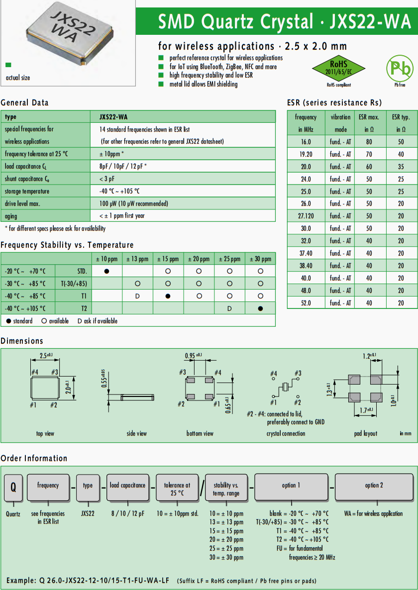 | Q 19.2-JXS22-9-10/10-WA-LF | Jauch Quartz | JXS22-WA | 19.2MHz | ±10ppm | 9pF |