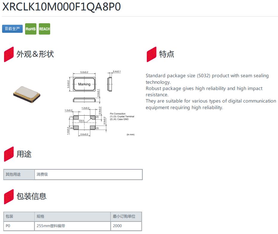 XRCLK10M000F1QA8P0|10MHz|-30~85℃|8pf|5032mm,XRCLK10M000F1QA8P0晶振,頻率10MHz,工作溫度-30~85℃,負(fù)載8pf,尺寸5032mm,高可靠性晶振,無線通訊設(shè)備晶振,WIFI晶振,通信設(shè)備晶振,數(shù)碼相機(jī)晶振,醫(yī)療設(shè)備晶振.
