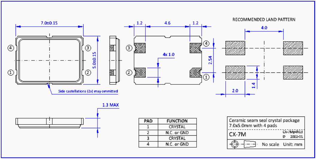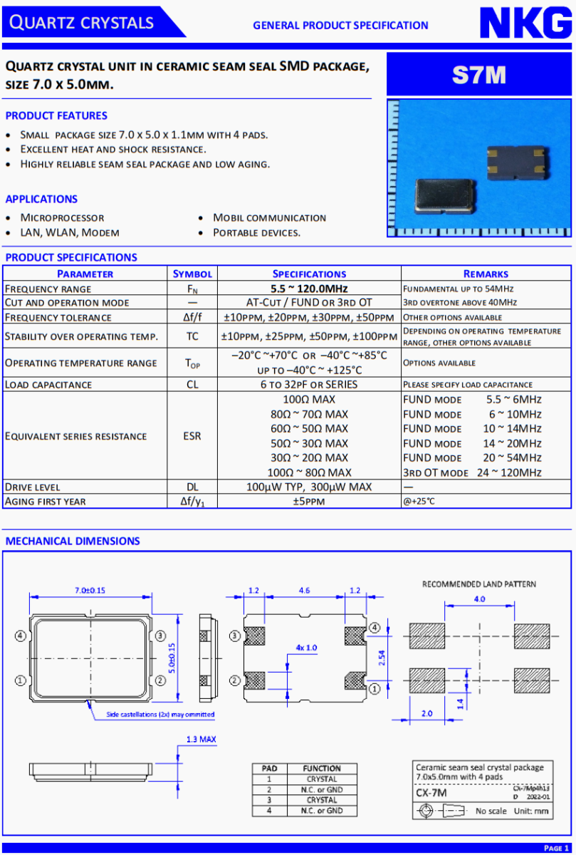 NKG7050晶振,S7M120.0000F18MYY-EXT晶振,車載氛圍燈晶振,。NKG晶振公司,無線傳輸晶振,汽車藍(lán)牙晶振,移動通訊晶振,石英晶振,石英晶體單元在陶瓷縫密封SMD封裝,尺寸7.0 x 5.0mm。S7M。產(chǎn)品特點:小包裝尺寸7.0 x 5.0 x 1.1mm, 4個襯墊。優(yōu)異的耐熱性和抗震性。高可靠的縫封封裝,低老化。應(yīng)用:微處理器,局域網(wǎng),無線局域網(wǎng),調(diào)制解調(diào)器,移動通信,便攜式設(shè)備。高品質(zhì)晶振,低損耗晶振,汽車級晶振,車載音響系統(tǒng)晶振,便攜設(shè)備晶振,USB存儲設(shè)備晶振。4025晶振,小體積晶振,超薄晶振,貼片晶振,進(jìn)口晶振,
