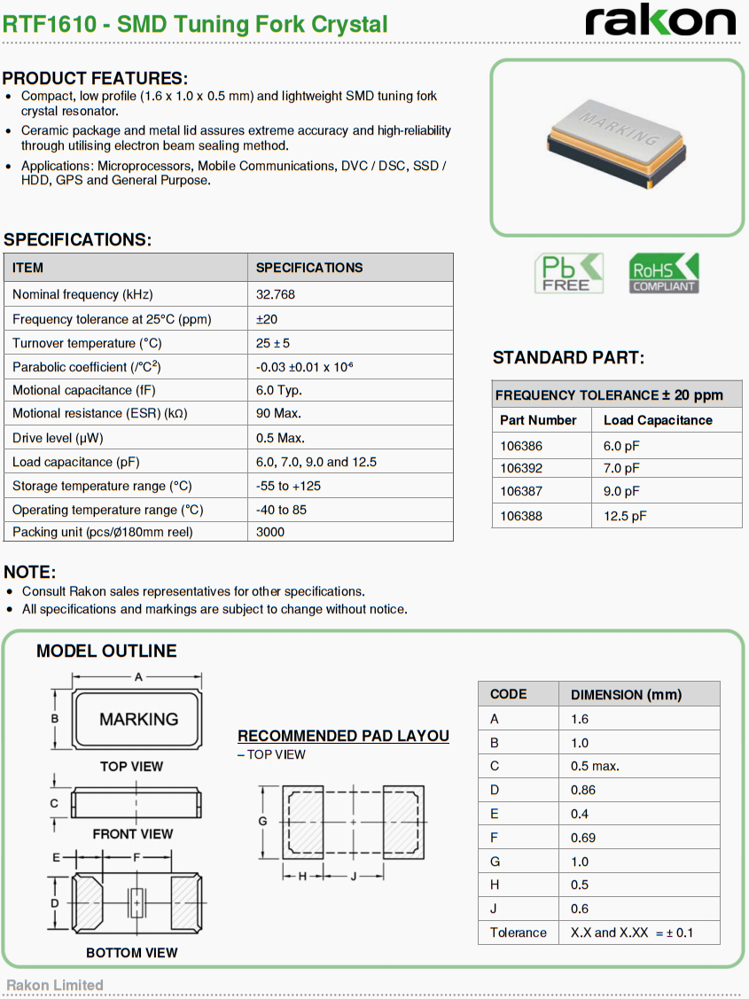 Rakon瑞康晶振,6G信號接收器晶振,RTF1610二腳晶振,新西蘭瑞康晶振,Rakon晶振,進(jìn)口晶振,歐美晶振,6G信號接收器晶振,二腳晶振,32.768K晶振,石英晶振,貼片晶振,無源晶振,緊湊,低輪廓(1.6 x 1.0 x 0.5毫米)和輕量級SMD音叉晶體諧振器。陶瓷封裝和金屬蓋通過電子束密封方法確保極高的精度和高可靠性。應(yīng)用:微處理器,移動通信,DVC / DSC, SSD /HDD, GPS和通用。
