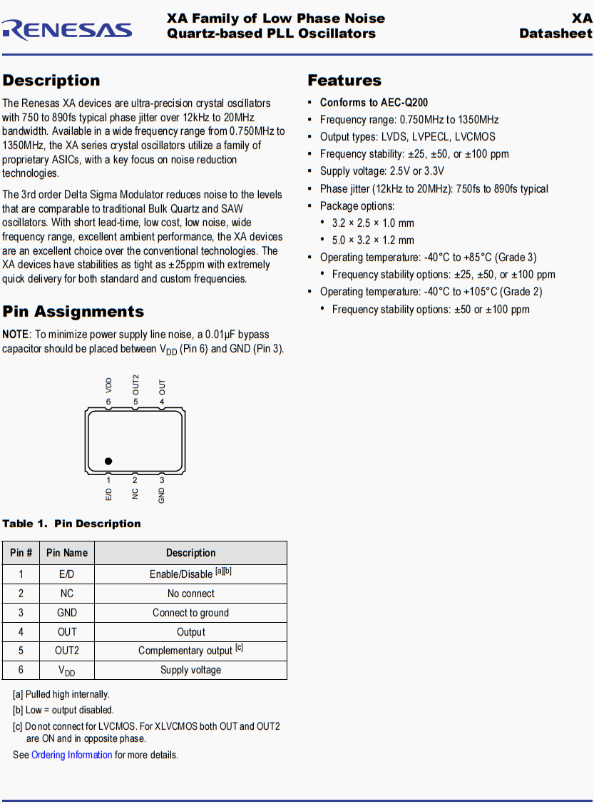 | XAL335A00.000000K | Renesas晶振 | XA | 1 GHz | LVDS | 3.3V | ±50ppm |