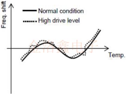 如果諧振器單元的實(shí)際驅(qū)動電平大于指定的最大驅(qū)動電平,則可能會出現(xiàn)振蕩頻率異常的溫度特性.這可能是IC功能出現(xiàn)問題的原因.