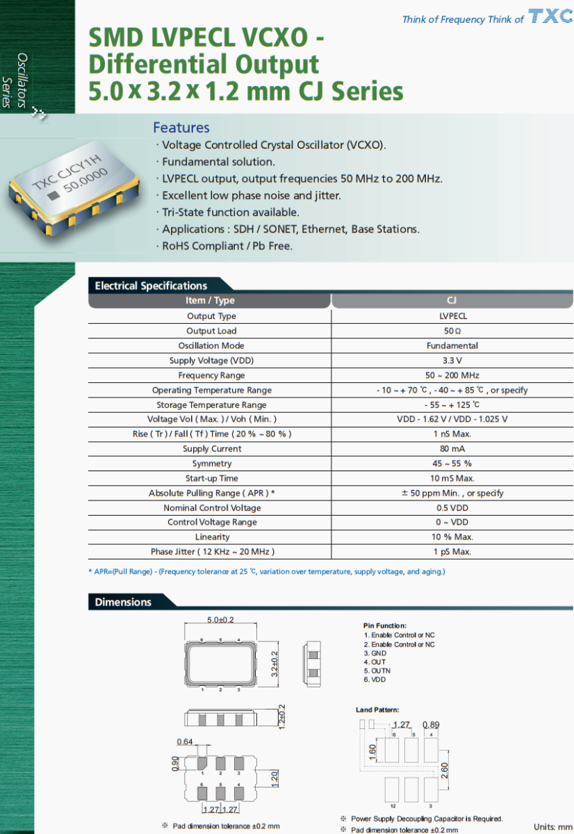 | CJ-156.250MBE-T | TXC晶振 | CJ | 156.25 MHz | LVPECL | 3.3V | ±50ppm |