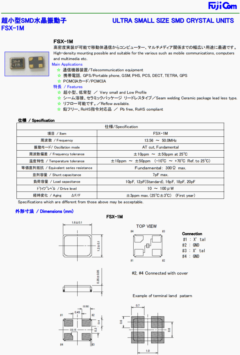 | FCX1M04210512E3J | Fuji晶振 | FCX-1M | 42.105 MHz | ±30ppm | ±20ppm | 12pF | -20°C ~ 70°C |