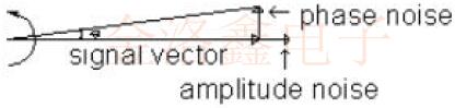 剛開始時,相位噪聲可能看起來有些神秘,但是熟悉"普通"噪聲和"普通"功率譜密度的任何工程師都可以很快地提高速度,石英晶體振蕩器的輸出可以由相量圖表示. 該信號由一個向量表示,該向量的長度與信號幅度成正比,該幅度圍繞振蕩器的頻率圍繞原點旋轉(zhuǎn),這個矢量的頂端是一個隨機的,指向振蕩器的噪聲的小矢量.該噪聲矢量可以由兩個正交矢量表示,一個正交指向信號矢量的方向,一個正交指向旋轉(zhuǎn)的方向.振幅矢量是熟悉的振幅噪聲,另一個矢量是相位噪聲矢量.顯然,當振幅矢量改變時,振蕩器的整體振幅改變,而當相位噪聲矢量改變時,振蕩器的相位改變,盡管將幅度抖動與總幅度進行比較很直觀,將弧度的相位抖動與載波的幅度進行比較似乎是任意的,這兩個量似乎無關(guān).困惑在于小角度假設(shè)的腳,該假設(shè)指出小角度的正弦等于該角度.