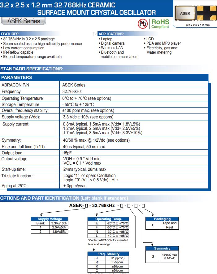 | ASEK1-32.768KHZ-LRT | Abracon晶振 | ASEK | XO (Standard) | 32.768kHz | 2.5V | -40°C ~ 85°C |