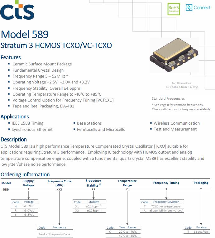 CTS 589型是一款高性能溫度補(bǔ)償晶體振蕩器[TCXO],適用于要求地層3性能的應(yīng)用。采用集成電路技術(shù)與HCMOS輸出和模擬溫度補(bǔ)償發(fā)動(dòng)機(jī);加上基礎(chǔ)石英晶體M589具有優(yōu)良的穩(wěn)定性和低抖動(dòng)/相位噪聲性能。