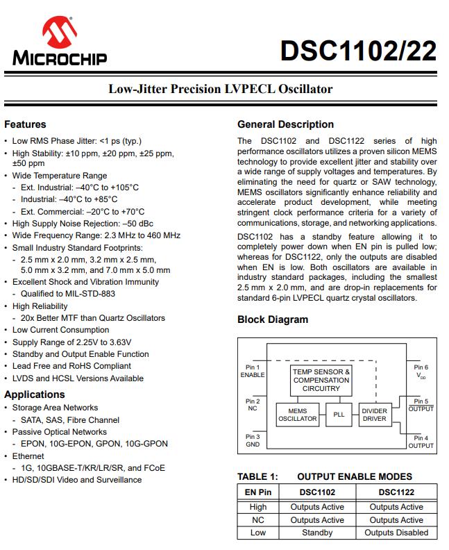 | DSC1121CE5-100.0000T | Microchip可編程振蕩器 | DSC1121 | Active | MEMS (Silicon) | 100MHz | 2.25 V ~ 3.6 V |