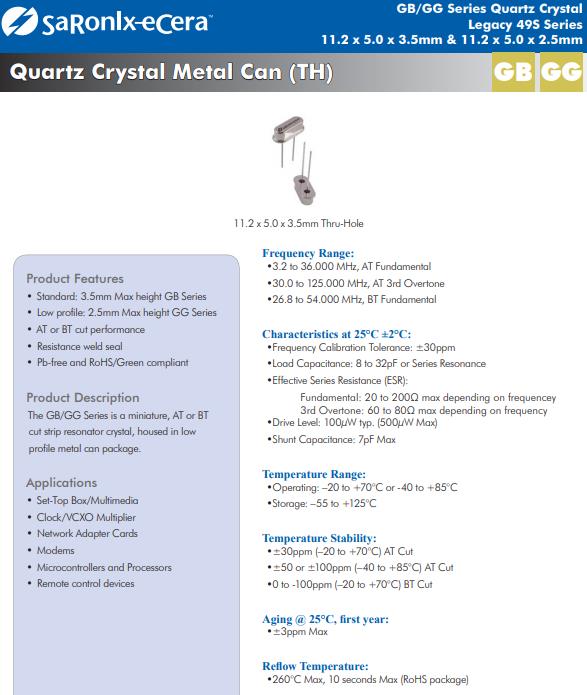 產(chǎn)品特性:標(biāo)準(zhǔn):3.5mm最大高度GB系列,低外形:最大高度2.5mmGG系列,AT或BT cut性能,電阻焊密封,無鉛,符合RoHS/綠色標(biāo)準(zhǔn)