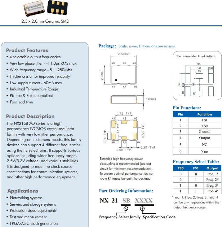 具有極低抖動(dòng)性能的高性能LVCMOS晶體振蕩器NX21SB XO系列,NX21SBXXXX,小體積尺寸2.5mmx2.0mm貼片振蕩器,CMOS四頻可編程XO,根據(jù)客戶(hù)的需求,該系列器件可以使用 FS 選擇引腳支持 4 種不同的頻率。它支持多種選擇,包括更寬的頻率范圍、2.5V/3.3V 電壓和各種穩(wěn)定性。它旨在滿(mǎn)足通信系統(tǒng)和其他高性能設(shè)備的時(shí)鐘源規(guī)范。特征: