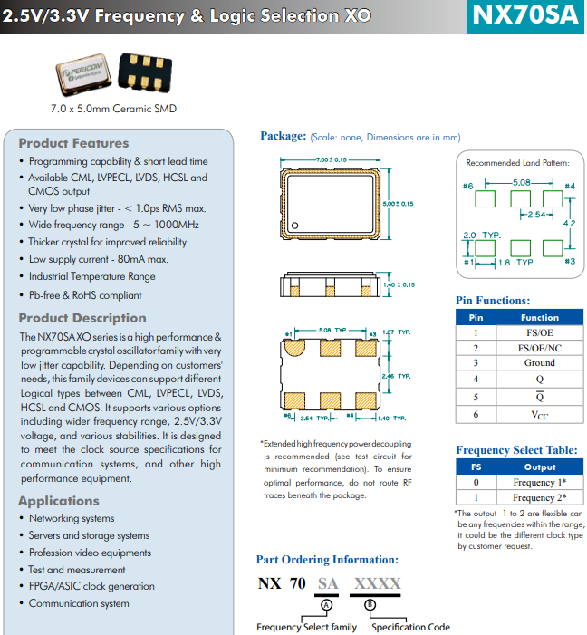 | NX70SA | CMOS/LVPECL/LVDS/HCSL/CML(可選) | 3.32.5 | 5 到 1000 | <1 | 7.0 x 5.0 x 2.0 | 6 | 7.0mmx5.0mm 雙頻邏輯可編程 XO | |