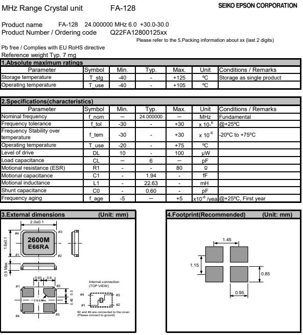 | Q22FA1280012500 | 2 x 1.6 x 0.5mm | FA-128 | 24.000000 MHz | 6 pF | +/-30 ppm |