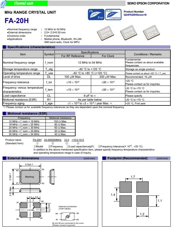 | Q24FA20H0066700 | 2.5 x 2 x 0.55mm | FA-20H | 12.000000 MHz | 10 pF | +/-30 ppm | +/-20 ppm |