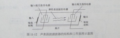 如圖11-12所示是聲表面波濾波器的結(jié)構(gòu)和工作原理示意圖。在輸入端和輸出端設(shè)有叉指形電極。當(dāng)給輸入端叉指形電極加上交變電信號(hào)時(shí),在輸入信號(hào)的交變電場(chǎng)作用下,由于晶體的壓電效應(yīng),在基片表面激起機(jī)械振動(dòng),形成聲表面波。