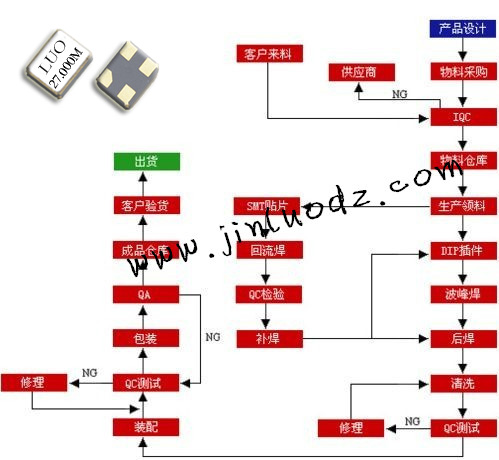 制作石英晶振的原材料是石英礦物質(zhì)。石英礦物質(zhì)在經(jīng)過(guò)提煉,精煉后制成具有壓電效應(yīng)的石英晶體。石英晶體在經(jīng)過(guò)清洗,鍍銀,上架點(diǎn)膠,微調(diào),測(cè)試(測(cè)試如果不成功則要返回微調(diào),再重新調(diào)試),除濕,壓封,絕緣(不良仍需回到微調(diào)重新調(diào)試,調(diào)試成功才運(yùn)行下一步驟),打字,外觀檢驗(yàn),包裝,終檢合格后才被允許入庫(kù)。其中幾個(gè)需要注意事項(xiàng):