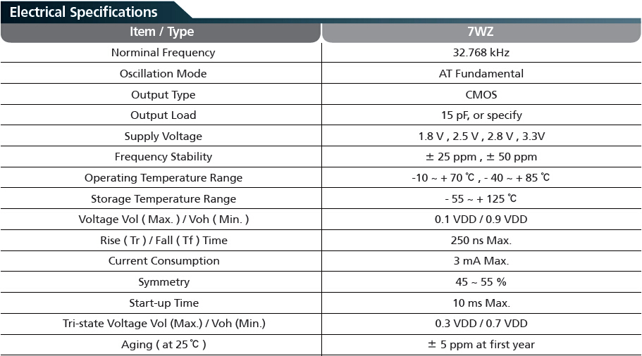 首先出場的是TXC 32.768K有源晶振中體積最大的7WZ石英晶振,參數(shù)如下: