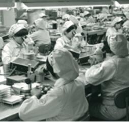 圖2:音叉晶體單元的頻率調節(jié)過程1970年代初期,音叉晶體單元的頻率調節(jié)過程.此圖顯示了工作中的婦女使用金剛石砂輪手工切割音叉晶體單元的前邊緣,以調節(jié)頻率.