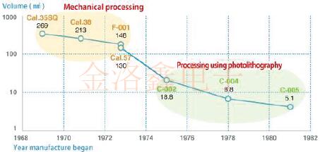 同時,另一項新技術正在悄然開發(fā),以支持光刻技術的實施.該公司的準備工作是水密的.終于在1975年開始量產"C-002",這是第一款應用光刻技術的音叉晶體裝置(圖4).其外部尺寸為2mm(半徑)x6mm(長度).它很小,僅為上一代晶體單元"Cal.57型"的1/7(圖5).他們成功地使晶體裝置更加緊湊.