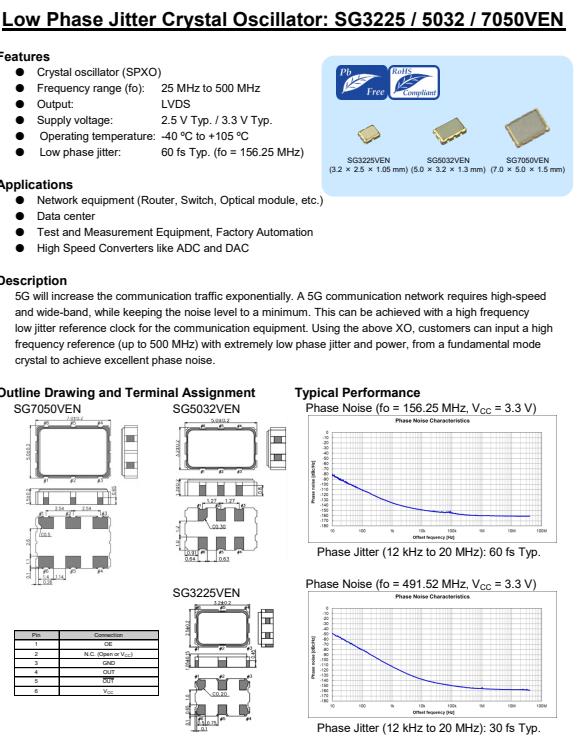 SG7050VEN | 100.000000 MHz | 7.00 x 5.00 x 1.70 mm | LVDS | 3.135 to 3.465 V | -40 to 85 °C | +/-25 ppm |