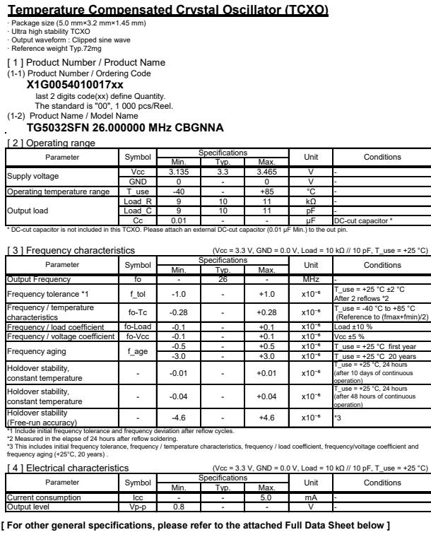 | X1G005391001100 | TG5032CFN | 26.000000 MHz | 5.00 x 3.20 x 1.45 mm | 3.135 to 3.465 V | +/-1.0 ppm | -40 to ++85 °C | +/-0.28 ppm |