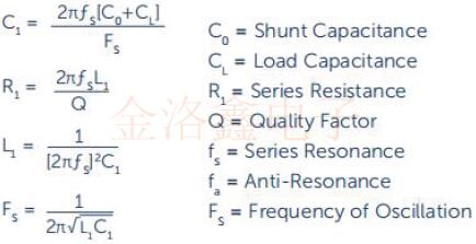 最常見的晶體設(shè)計之一是AT切割晶體,它將是貫穿本應(yīng)用筆記的參考晶體類型.對于1兆赫以上的頻率,通常只使用厚度剪切振動模式.AT切割晶體的頻率由晶體的厚度決定,即晶體越薄,頻率越高.諧振器的振動質(zhì)量相當(dāng)于一系列運(yùn)動電感,L1.晶體的機(jī)械損耗表現(xiàn)為等效串聯(lián)電阻R1,而晶體的機(jī)械彈性相當(dāng)于串聯(lián)電容C1.C0是與保持器和電極電容相關(guān)聯(lián)的并聯(lián)電容.AT切割晶體具有良好的穩(wěn)定性和溫度特性,這是它們受歡迎的原因之一. 公式-等效電子