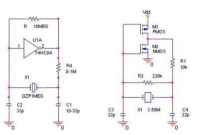 晶體穩(wěn)頻的多諧振蕩器:為了得到頻率比較穩(wěn)定的信號,需要晶體穩(wěn)頻形式有多種,但單反相器方式最為簡單,也最常用,許多MCU都用這種形式