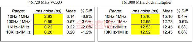 相位噪聲測試系統(tǒng)沿對數(shù)標度繪制頻率,每十年至少應選擇3個點.例如,為了獲得均勻分布的點,我們選擇使用10、20、50、100、200…等方法.點越多,相關性越好.剩下的就是取求和的平方根,然后除以(2*PI*Fo).我們已經(jīng)描述了使此任務輕松實現(xiàn)以電子表格實現(xiàn)或?qū)⑵渚幋a為BASIC或C程序所需的所有步驟,下面列出了以下結(jié)果,將該方法與Aeroflex PN9000相噪測試儀進行了比較,使用n=16點10Hz至1MHz. [供應商與客戶之間抖動抖動的相關性]