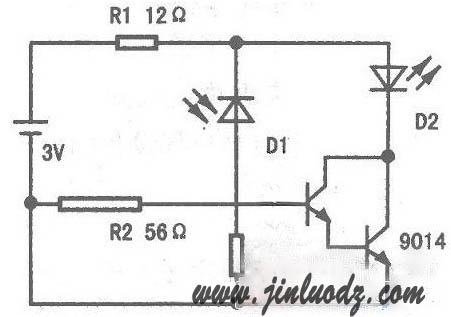 下圖的電路非常簡潔,2只NPN三極管組成復(fù)合管用于放大被測的遙控器紅外光信號,D1用扁平紅外線光敏二極管,D2用紅色圓型發(fā)光二極管,Rl為D2限流電阻,R2為遙控器上IC輸出限流電阻,R3與Dl組成分壓電路目的是泄掉Dl的反向穿透電流。如沒有R3,D2將長亮。電阻可使用1/8W的。