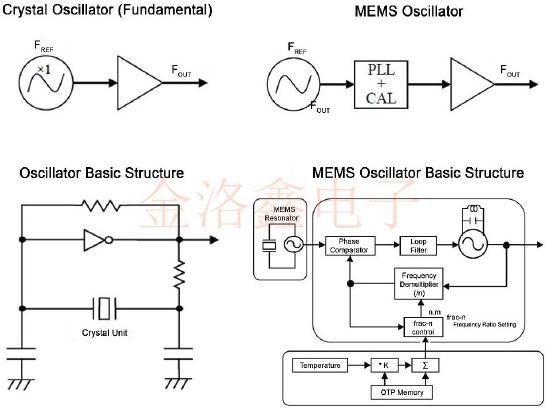 晶體振蕩器使用石英晶體基準(zhǔn)和簡單的振蕩器電路,MEMS振蕩器使用硅諧振器作為振蕩源,并需要PLL電路來校正頻率以達(dá)到制造公差和溫度系數(shù).正如這些基本結(jié)構(gòu)所示,晶體振蕩器是簡單構(gòu)建的高質(zhì)量時鐘.相反,MEMS振蕩器具有復(fù)雜的結(jié)構(gòu),該結(jié)構(gòu)由MEMS諧振器,分?jǐn)?shù)nPLL和溫度補(bǔ)償網(wǎng)絡(luò)組成.他們還需要進(jìn)行制造校準(zhǔn)才能正確運(yùn)行.