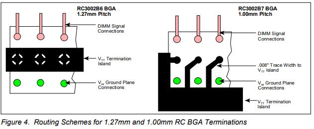 終端電阻應盡可能靠近雙列直插式內存模塊(DIMM)插槽,以最大限度地減少信號路由長度。如果使用電阻陣列或僅帶終端電阻的BGA網絡,雙通電容應放置在VTT終端島和VSS平面之間,每兩個終端電阻至少有一個0.01μF電容,間隔均勻。采用任何一種端接方法,PCB應在端接島的每端包含一個10μF鉭電容,用于批量去耦。圖3顯示了采用帶終端電阻和雙極電容的BGA封裝的完整終端解決方案示例。