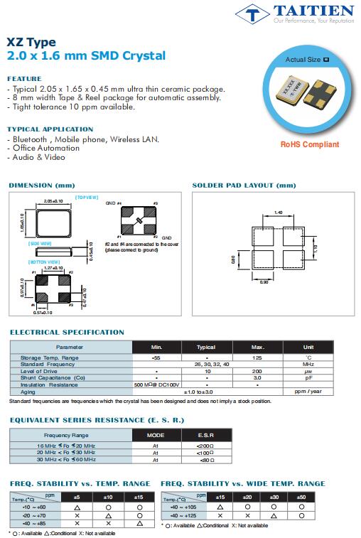 | XZBBCDAANF-26.000000 | Taitien晶振 | XZ | 26MHz | -30°C ~ 85°C | 0.081" L x 0.065" W (2.05mm x 1.65mm) |