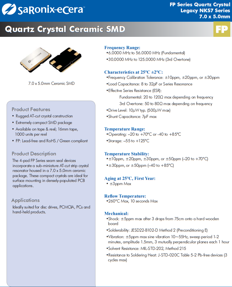 •FP系列接縫密封裝置包括包括一個亞微米結(jié)構(gòu)AT-cut帶狀晶體器件,該器件安裝在7.0 x 5.0mm的集成電路封裝年齡,這些緊湊的晶體是理想的表面安裝在密集的流行,而不是印刷電路板應(yīng)用程序